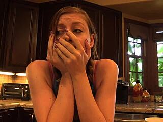 Naughty stepsister fingers herself to orgasm in front of mirror. Brunette milf adds fingering and masturbation intensity.